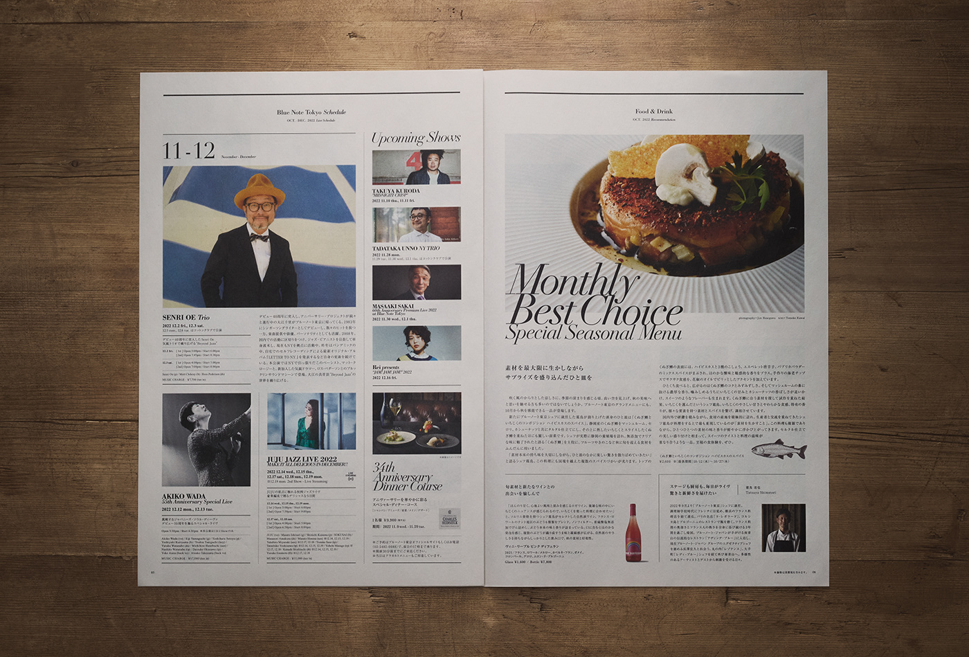 Dinner, another attraction of Blue Note Tokyo, is introduced with photographs of speciality dishes and wines. The ingredients of choice are illustrated.