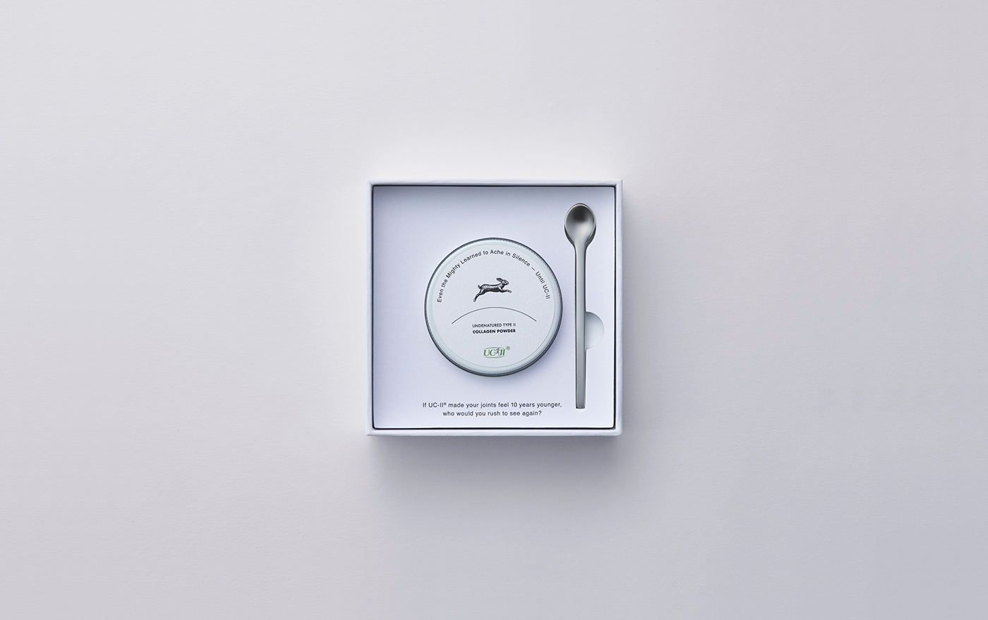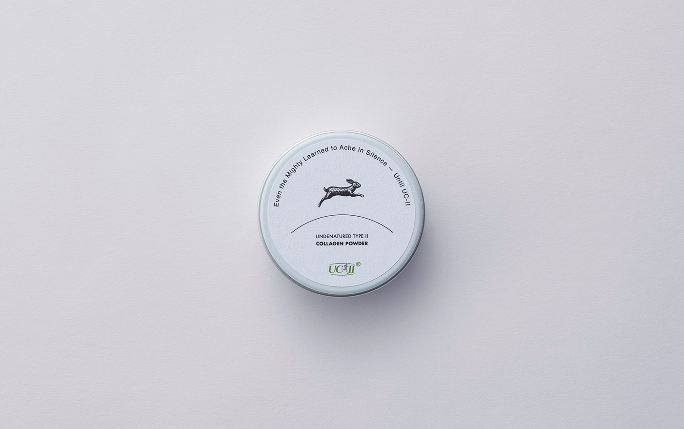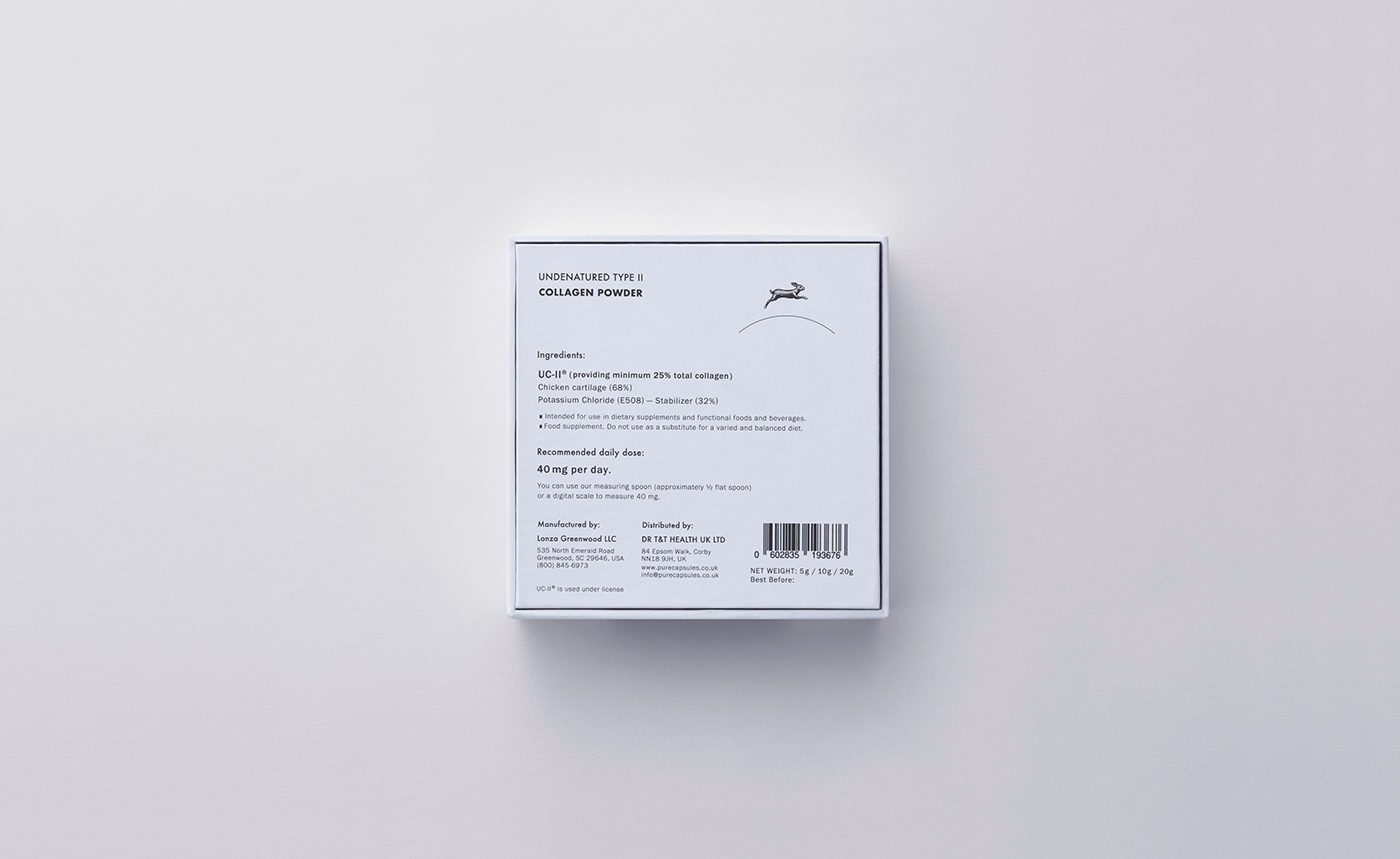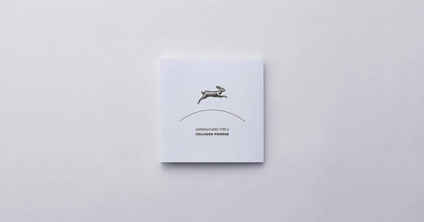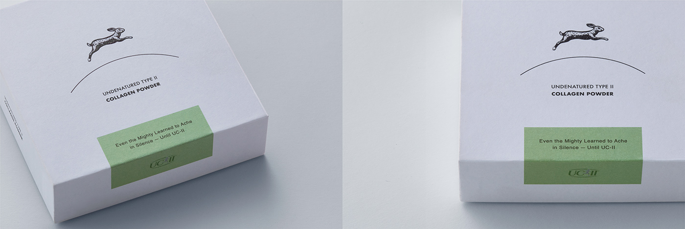 A renewed package design for Pure Capsules’ UC-II collagen powder supplement. A rabbit—symbolizing vitality, agility, and the ability to leap—was chosen as the emblem of the UC-II collagen powder. The ground is expressed with a single curved line, above which the rabbit runs lightly, forming the central visual motif. Generous negative space emphasizes the cleanliness expected of a supplement and highlights the brand’s sense of transparency. The open layout further accentuates the rabbit icon, creating visual rhythm and a sense of lightness throughout the design.