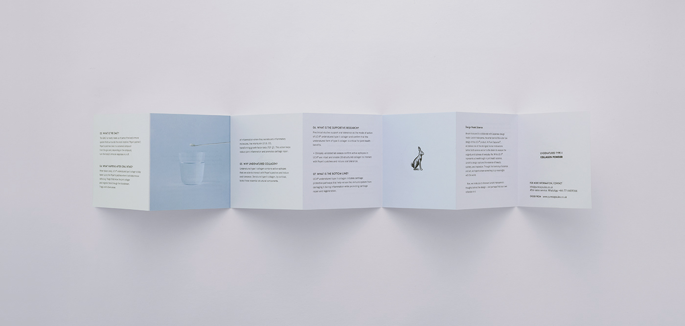 The sense of vitality gained from taking collagen powder is visualized through the brand’s rabbit character. As a symbol of lightness and life force, the motif aligns the pamphlet’s visuals with the world established in the packaging design. To communicate the usage method clearly and intuitively, a simple layout combining photography was adopted. The structure delivers essential information with clarity, balancing product appeal with practical ease of understanding.