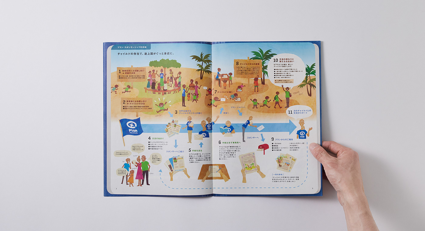 そのため、Plan Japanの活動を伝えるビジュアル制作においては、コピーライターと幾度も検討を重ねながら、「支援の価値を的確に伝える言葉の選定」に特に配慮した。また、日本と支援国、そして支援者との関係性や仕組みなど、言葉だけでは伝えづらい要素については、イラストや写真を用いた表現を検討。視覚的に理解しやすいコミュニケーション設計を行った。